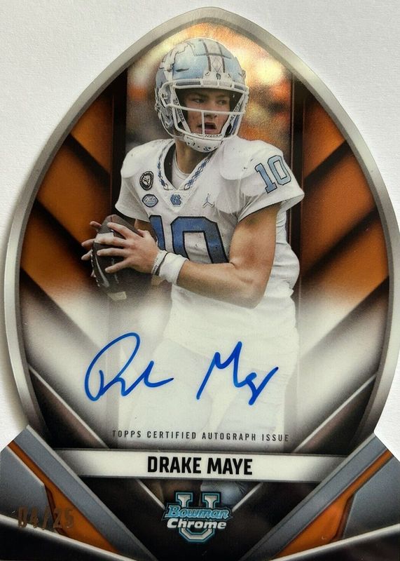 Auctions Ending Soon for Drake Maye 2023 Bowman Chrome University #FOFA-DM Future of Football Autographs - Orange Refractor /25 RAW