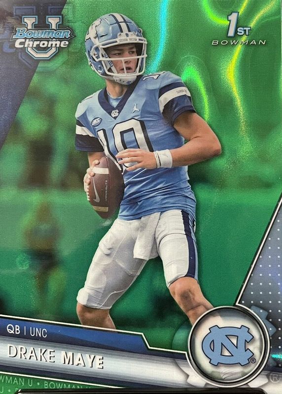 Auctions Ending Soon for Drake Maye 2023 Bowman Chrome University #200 Prospects - Green Lava Refractor /99 (1st) RAW
