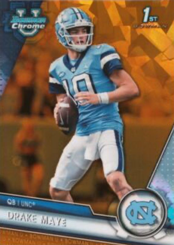 Best Prices Available For Sale of Drake Maye 2023 Bowman Chrome University Sapphire Edition #200 Gold /50 (1st)