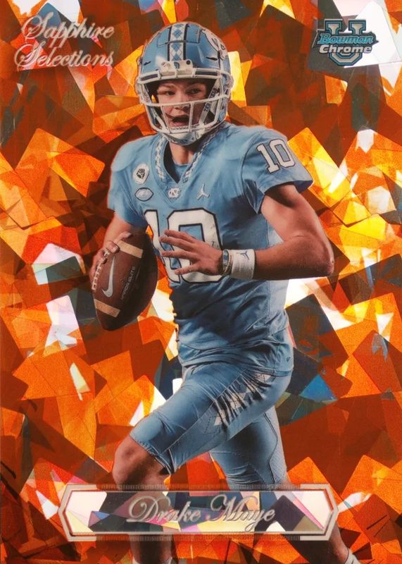 Best Prices Available For Sale of Drake Maye 2023 Bowman Chrome University Sapphire Edition #SS-10 Sapphire Selections - Orange /25