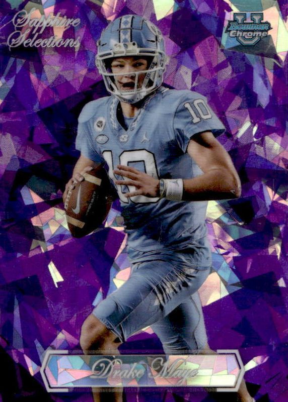 The Drake Maye 2023 Bowman Chrome University Sapphire Edition #SS-10 Sapphire Selections - Purple /10 card in Raw condition has not changed in price in the last 30 days and was last sold for $132.50 .