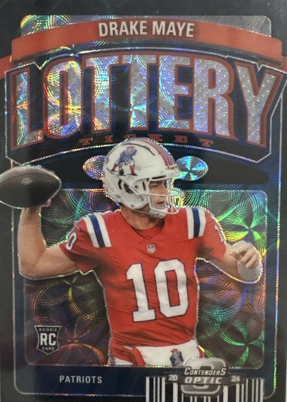 The Drake Maye 2024 Contenders Optic #LT-DME Lottery Ticket - Black Scope /25 Rookie card in Raw condition has not changed in price in the last 30 days and was last sold for $360.00 .