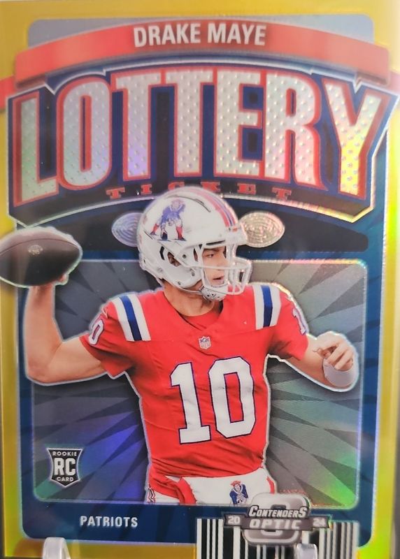 The Drake Maye 2024 Contenders Optic #LT-DME Lottery Ticket - Gold /10 Rookie card in Raw condition has not changed in price in the last 30 days and was last sold for $1,699.00 .