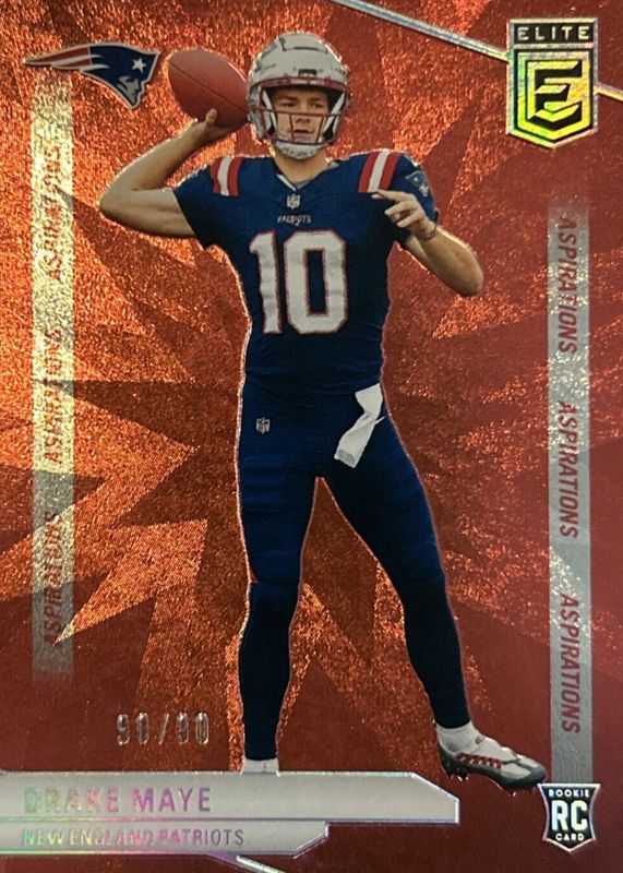 The Drake Maye 2024 Elite #185 Aspirations (/90) Rookie card in Raw condition has moved up $12.50 (+13.9%) in the last 30 days and was last sold for $102.50 .