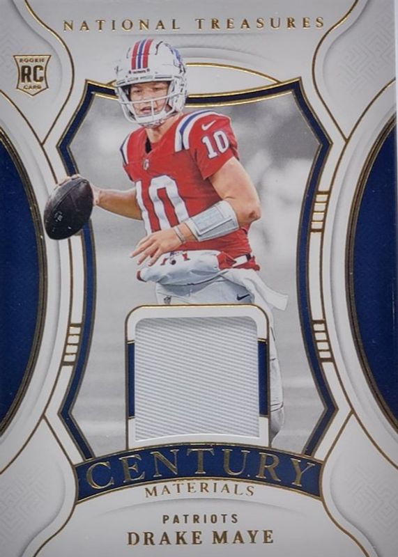 The Drake Maye 2024 National Treasures #CM-DME Century Materials - Gold /49 Rookie card in Raw condition has not changed in price in the last 30 days and was last sold for $104.42 .