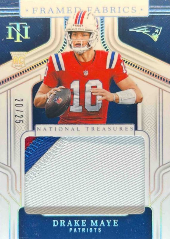 The Drake Maye 2024 National Treasures #FF-DME Framed Fabric - Holo Silver /25 Rookie card in Raw condition has not changed in price in the last 30 days and was last sold for $92.01 .