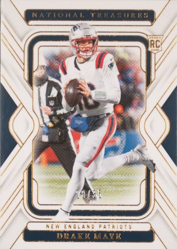 This card is 1 of 66 Drake Maye's card variations in the 2024 National Treasures set being tracked by Sports Card Investor, including Base /99, Red Jersey Number (/10), Purple /75, Holo Silver /25, and Midnight /20.