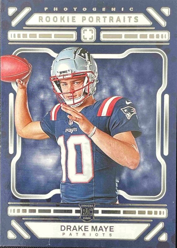 The Drake Maye 2024 Photogenic #194 Rookie Portraits card in Raw condition has moved down -$3.49 (-46.6%) in the last 30 days and was last sold for $4.00 .
