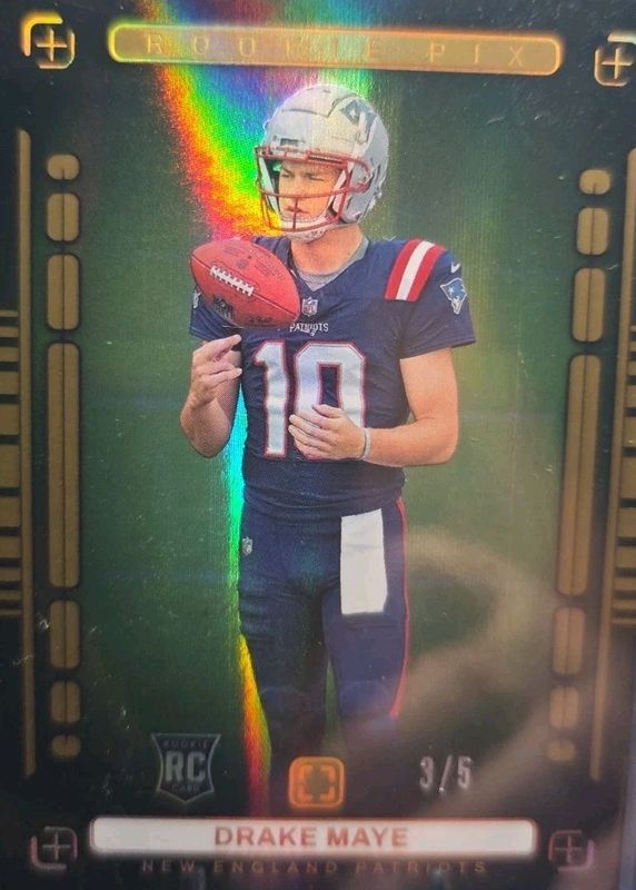 The Drake Maye 2024 Photogenic #194 Rookie Portraits - Gold /5 card in Raw condition has not changed in price in the last 30 days and was last sold for $560.00 .