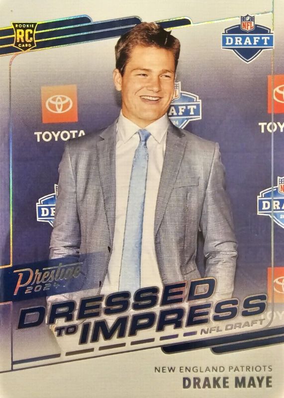 The Drake Maye 2024 Prestige #DTI-DMA Dressed to Impress /(SSP) Rookie card in Raw condition has moved down -$9.99 (-20.0%) in the last 30 days and was last sold for $40.00 .