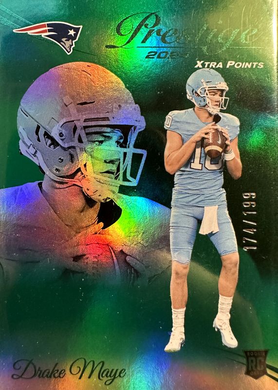 The Drake Maye 2024 Prestige #304 Green Premium Xtra Points /199 Rookie card in Raw condition has not changed in price in the last 30 days and was last sold for $13.00 .