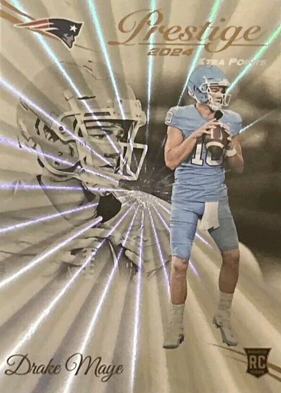 The Drake Maye 2024 Prestige #304 Sunburst Xtra Points Rookie card in Raw condition has moved up $0.01 (+0.1%) in the last 30 days and was last sold for $8.00 .