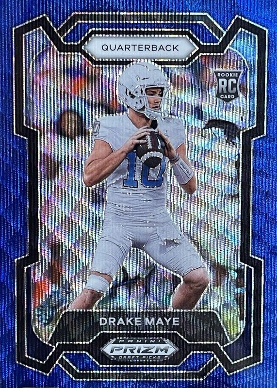 The Drake Maye 2024 Prizm Draft Picks #103 Blue Wave /249 Rookie card in Raw condition has not changed in price in the last 30 days and was last sold for $30.00 .