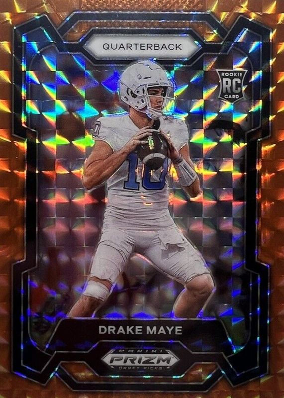 The Drake Maye 2024 Prizm Draft Picks #103 Orange Finite /39 Rookie card in Raw condition has not changed in price in the last 30 days and was last sold for $49.99 .