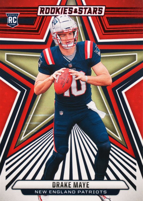 The Drake Maye 2024 Rookies & Stars #129 Red card in Raw condition has moved up $2.50 (+55.5%) in the last 30 days and was last sold for $6.99 .