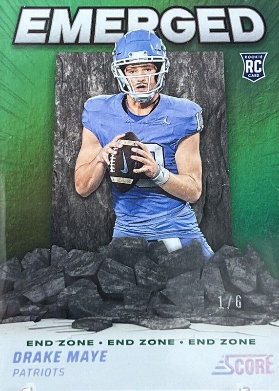 The Drake Maye 2024 Score #EM-DME Emerged - End Zone /6 Rookie card in Raw condition has not changed in price in the last 30 days and was last sold for $79.99 .