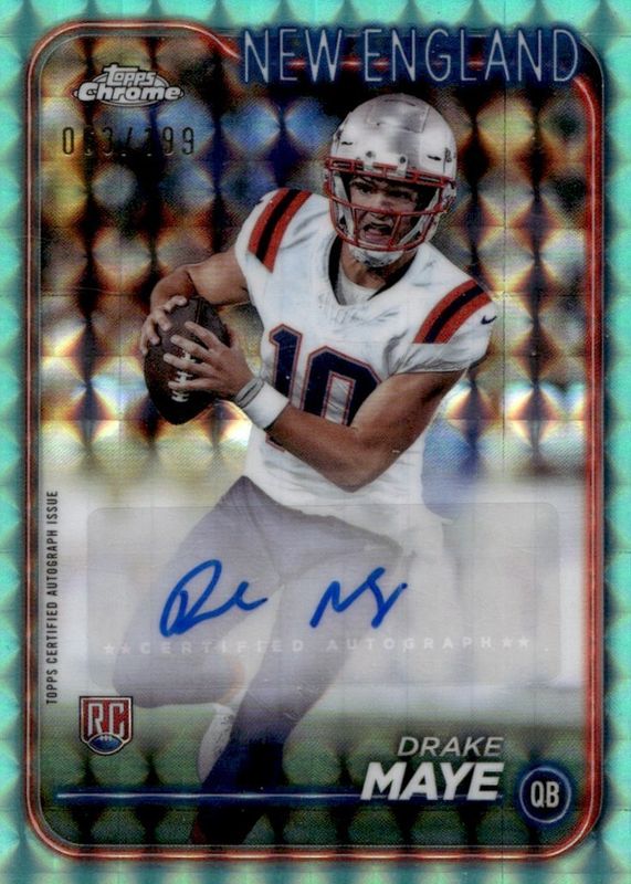 The Drake Maye 2024 Topps Chrome #RA-DMA Rookie Auto - Aqua Geometric Refractor /199 card in Raw condition has moved down -$199 (-22.1%) in the last 30 days and was last sold for $700.00 .