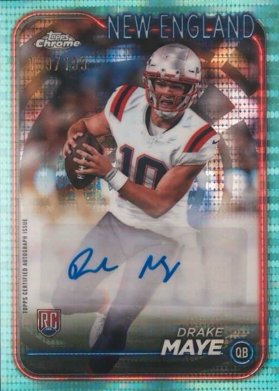 The Drake Maye 2024 Topps Chrome #RA-DMA Rookie Auto - Aqua Sonar Refractor /199 card in Raw condition has moved up $60.00 (+9.2%) in the last 30 days and was last sold for $710.00 .