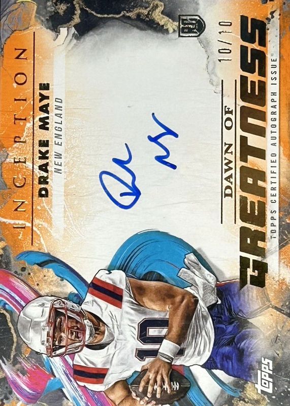 The Drake Maye 2024 Topps Inception #DGA-DM Dawn of Greatness Autographs - Orange /10 Rookie card in Raw condition has not changed in price in the last 30 days and was last sold for $1,700.00 .