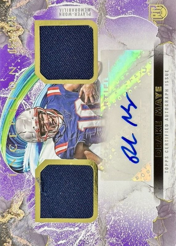 The Drake Maye 2024 Topps Inception #FFRA-DM Franchise Foundation Relic Autographs - Purple /125 Rookie card in Raw condition has not changed in price in the last 30 days and was last sold for $385.00 .