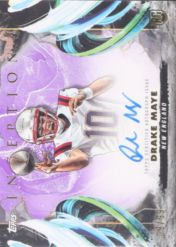 The Drake Maye 2024 Topps Inception #RA-DM Rookie Autographs Variation - Magenta /99 card in Raw condition has not changed in price in the last 30 days and was last sold for $382.06 .