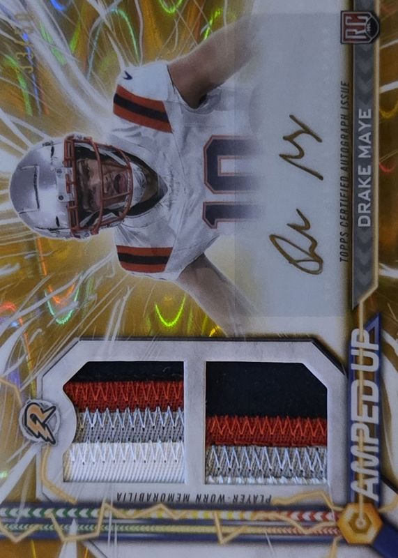 The Drake Maye 2024 Topps Resurgence #AU-DM Amped Up Rookie Patch Autographs - Gold Power Surge Refractor /50 card in Raw condition has not changed in price in the last 30 days and was last sold for $450.00 .