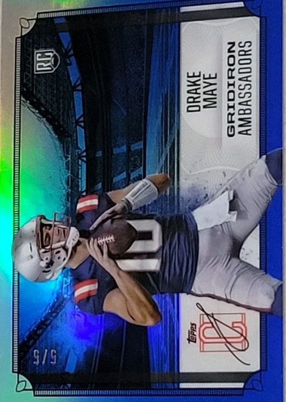 Auctions Ending Soon for Drake Maye 2024 Topps Signature Class #GA-3 Gridiron Ambassadors - Blue /5 Rookie RAW