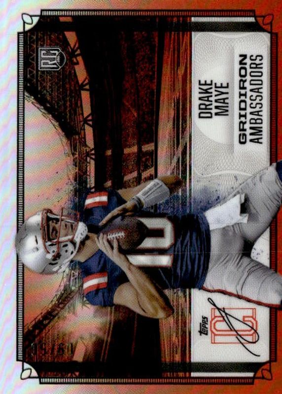 The Drake Maye 2024 Topps Signature Class #GA-3 Gridiron Ambassadors - Orange /50 Rookie card in Raw condition has not changed in price in the last 30 days and was last sold for $101.00 .
