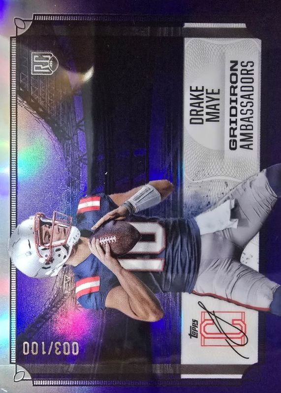 The Drake Maye 2024 Topps Signature Class #GA-3 Gridiron Ambassadors - Purple /100 Rookie card in Raw condition has not changed in price in the last 30 days and was last sold for $42.99 .