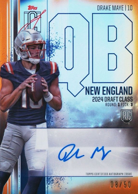 The Drake Maye 2024 Topps Signature Class #RCV-DM Rookie Chrome Autographs - Orange Refractor /50 card in Raw condition has not changed in price in the last 30 days and was last sold for $256.01 .