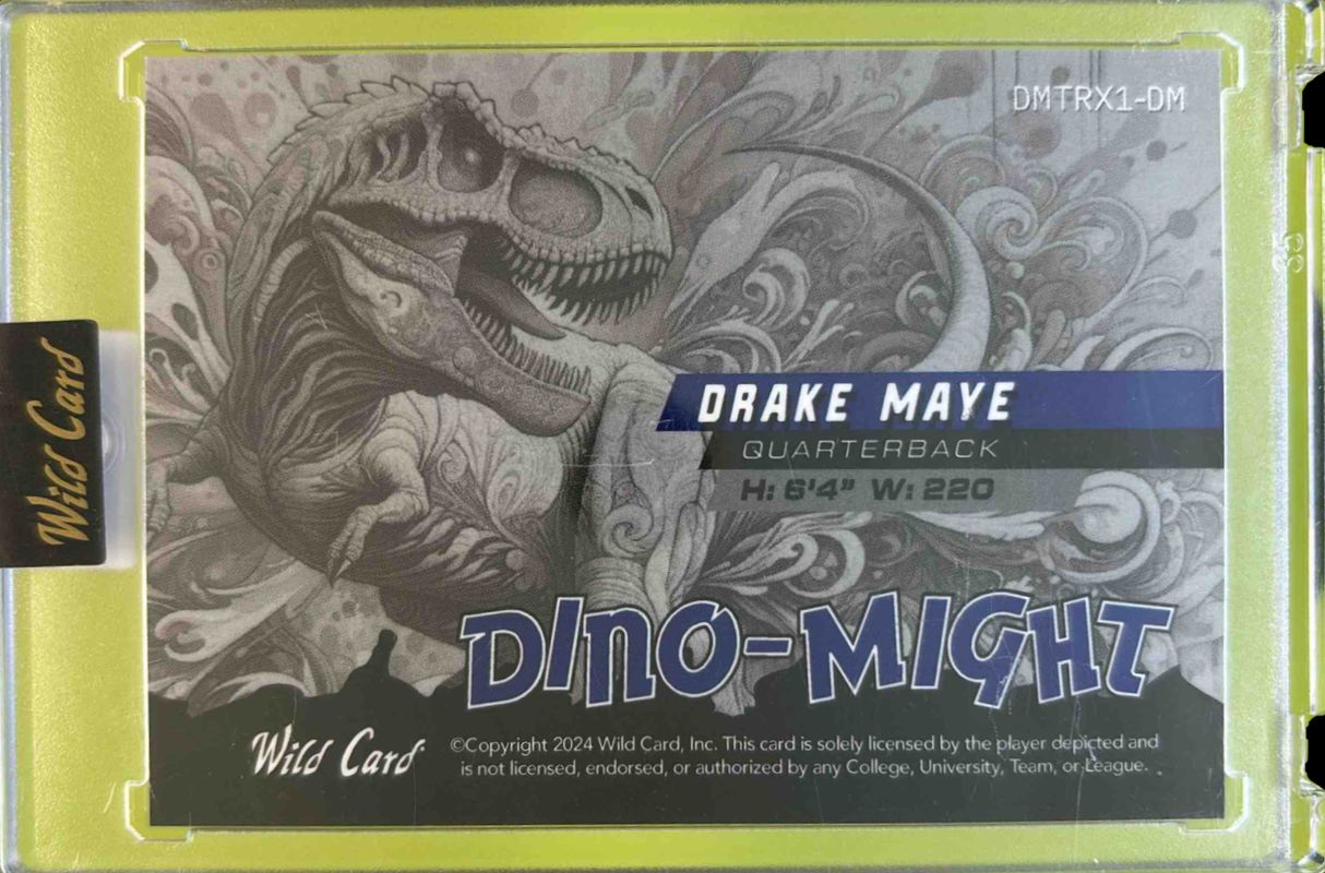 The Drake Maye 2024 Wild Card Alumination DinoMight #DMTRX1-DMA Tyrannosaurus Rex Auto - Rainbow Foil Board White /1 Rookie card is 1 of 376 Drake Maye's card variations in the 2024 Wild Card Alumination DinoMight set being tracked by Sports Card Investor, including Tyrannosaurus Rex - Cross Hatch Foil Board Gold, Tyrannosaurus Rex - Rainbow Foil Board Bronze, Pteradactyl - Mirror Foil Board Green /25, Stegosaurus - Mirror Foil Board Green /25, and Triceratops - Mirror Foil Board Green /25.