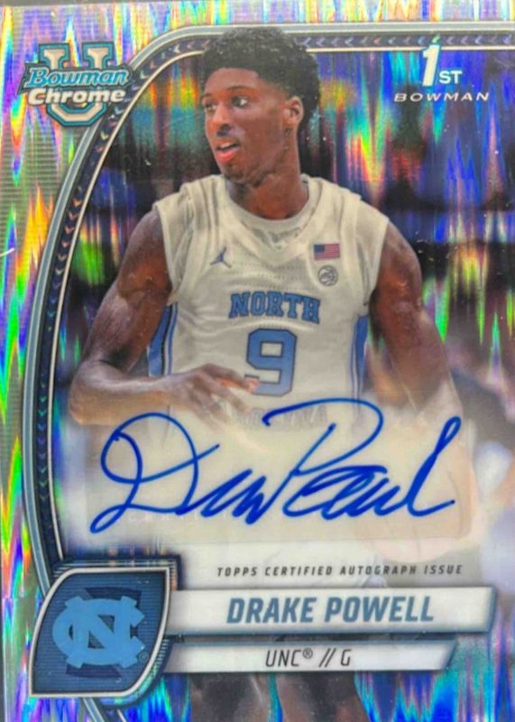 This card is 1 of 19 Drake Powell's card variations in the 2024 Bowman Chrome University set being tracked by Sports Card Investor, including Prospect Auto (1st), Prospect Auto - Black Wave Refractor (1st), Prospect Auto - Green Shimmer Refractor (1st), Prospect Auto - Refractor (1st), and Prospect Auto - Reptilian Blue Refractor /150 (1st).