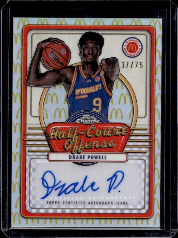 The Drake Powell 2024 Topps Chrome McDonald's All-American #IML-DRA Half-Court Signatures - McDonald's Logo Refractor /75 card is 1 of 112 Drake Powell's card variations in the 2024 Topps Chrome McDonald's All-American set being tracked by Sports Card Investor, including #81 Base, #31 Base, #31 Blue RayWave Refractor, #81 Blue RayWave Refractor, and #31 McDonald's Logo Refractor.
