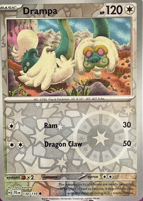 The Drampa 2025 Scarlet & Violet: Journey Together #130/159 Reverse Holo card in Raw TCG (Lightly Played) condition has not changed in price in the last 30 days and was last sold for $2.54 .