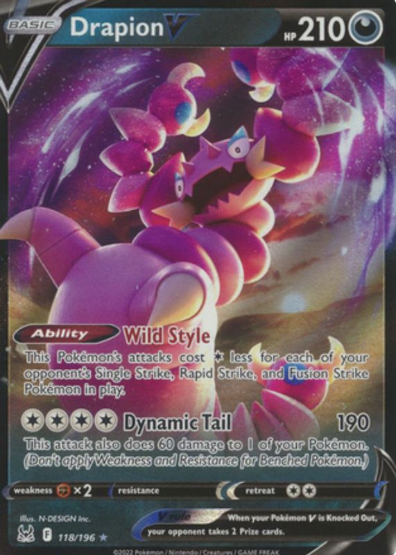 The Drapion V 2022 Sword & Shield: Lost Origin #118/196 Holo card in Raw TCG (Near Mint) condition has moved down -$0.08 (-4.7%) in the last 30 days and was last sold for $1.71 .