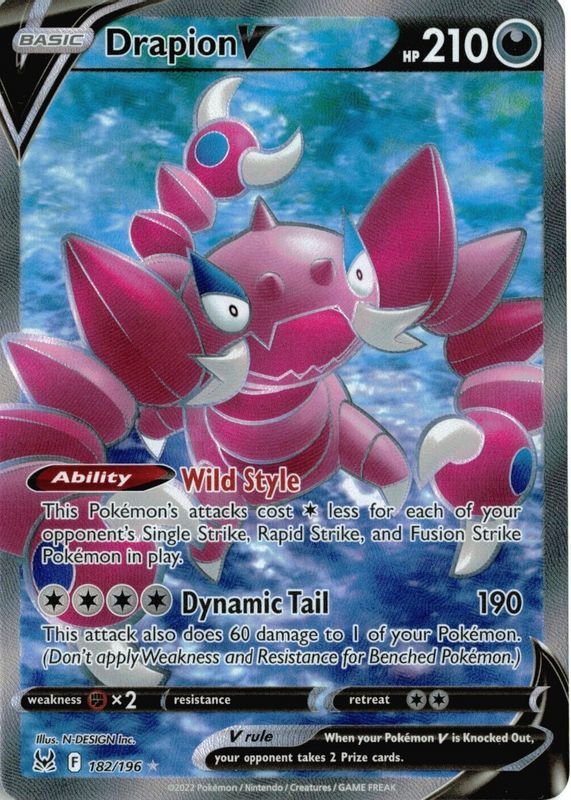 The Drapion V 2022 Sword & Shield: Lost Origin #182/196 Holo (Full Art) card in Raw TCG (Near Mint) condition has moved up $0.94 (+94.4%) in the last 30 days and was last sold for $1.93 .