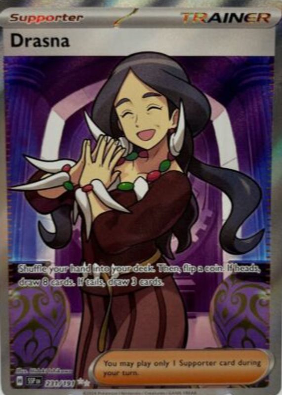The Drasna 2024 Scarlet & Violet: Surging Sparks #231/191 Ultra Rare (Full Art) card in Raw TCG (Near Mint) condition has moved up $1.58 (+83.2%) in the last 30 days and was last sold for $3.48 .