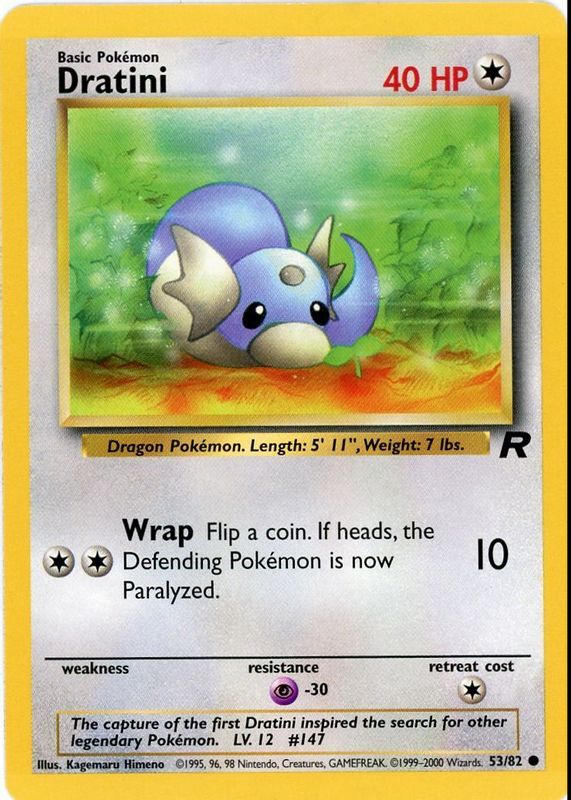 The Dratini 2000 Team Rocket #53/82 Unlimited card in Raw TCG (Near Mint) condition has moved up $1.48 (+106%) in the last 30 days and was last sold for $2.87 .