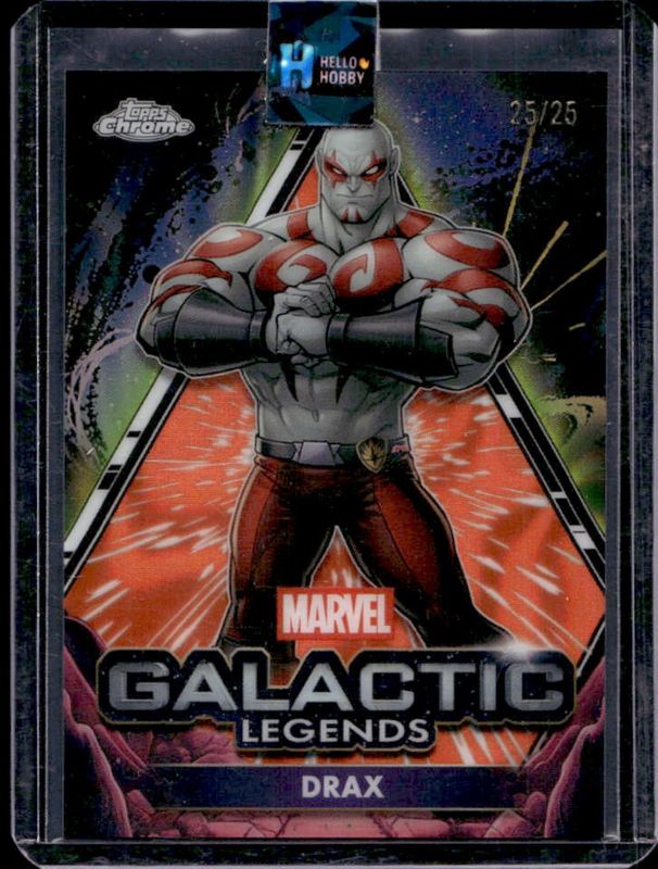 The Drax 2025 Topps Chrome #GL-10 Galactic Legends - Orange Lava Refractor /25 card is 1 of 30 Drax's card variations in the 2025 Topps Chrome set being tracked by Sports Card Investor, including Base, Refractor, Yellow Lava Refractor, Spider Web Refractor /399, and Blue Refractor /299.