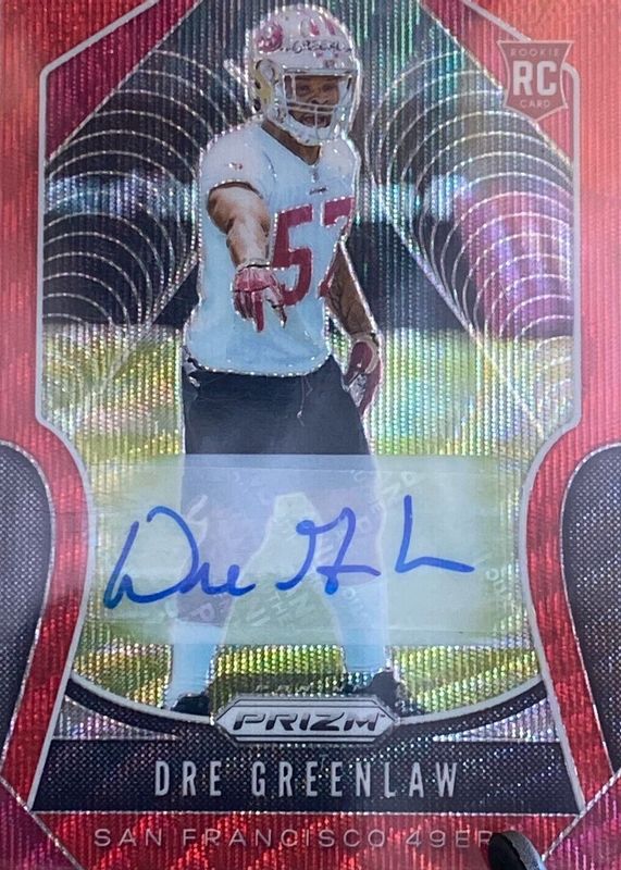 The Dre Greenlaw 2019 Prizm #384 Rookie Autographs - Red Wave /149 card in Raw condition has not changed in price in the last 30 days and was last sold for $45.05 .
