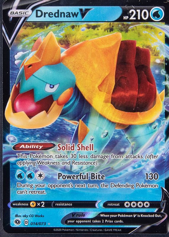 The Drednaw V 2020 Champion's Path #14/73 Holo card in Raw TCG (Near Mint) condition has not changed in price in the last 30 days and was last sold for $5.50 .
