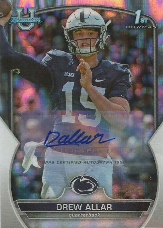 This card is 1 of 12 Drew Allar's card variations in the 2022 Bowman Chrome University set being tracked by Sports Card Investor, including Prospect Auto (1st), Prospect Auto - Refractor /499 (1st), Prospect Auto - Green Refractor /99 (1st), Prospect Auto - Yellow Refractor /75 (1st), and Prospect Auto - Gold Lava Refractor /50 (1st).