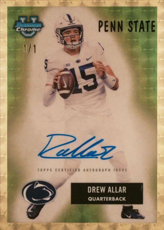 This card is 1 of 21 Drew Allar's card variations in the 2023 Bowman Chrome University set being tracked by Sports Card Investor, including Prospect Auto, Prospect Auto - Refractor /499, Prospect Auto - Fuchsia Mini-Diamond Refractor /150, The Big Kahuna Autographs /150, and 1955 Bowman Football Autographs /99.