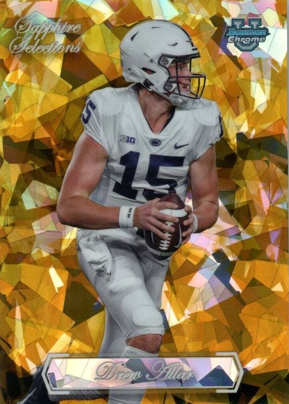 The Drew Allar 2023 Bowman Chrome University Sapphire Edition #SS-14 Sapphire Selections - Gold /50 card in Raw condition has not changed in price in the last 30 days and was last sold for $68.00 .