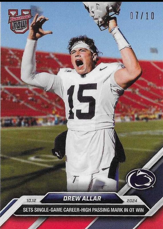This card is 1 of 18 Drew Allar's card variations in the 2024 Bowman U Now set being tracked by Sports Card Investor, including #28 Base (Print Run: 870), #15 Base (Print Run: 1,067), #15 Blue /49, #28 Blue /49, and #15 Purple /25.