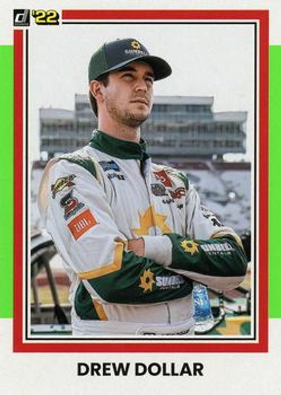 The Drew Dollar 2022 Donruss NASCAR #192 Lime Green card is 1 of 21 Drew Dollar's card variations in the 2022 Donruss NASCAR set being tracked by Sports Card Investor, including Base, Carolina Blue, Silver, Red /299, and Navy Blue /199.