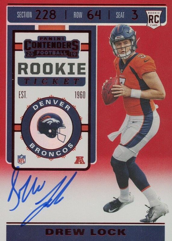 The Drew Lock 2019 Contenders #104 Rookie Ticket Auto - Red Zone Ticket card in Raw condition has not changed in price in the last 30 days and was last sold for $78.00 .