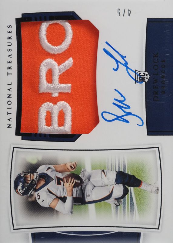 This card is 1 of 11 Drew Lock's card variations in the 2019 National Treasures set being tracked by Sports Card Investor, including Rookie Patch Auto /99, Rookie Patch Auto - Green Jersey Number (/3), Rookie Patch Auto - Holo Silver /25, Rookie Patch Auto - Midnight /20, and Rookie Patch Auto - Holo Gold /10.