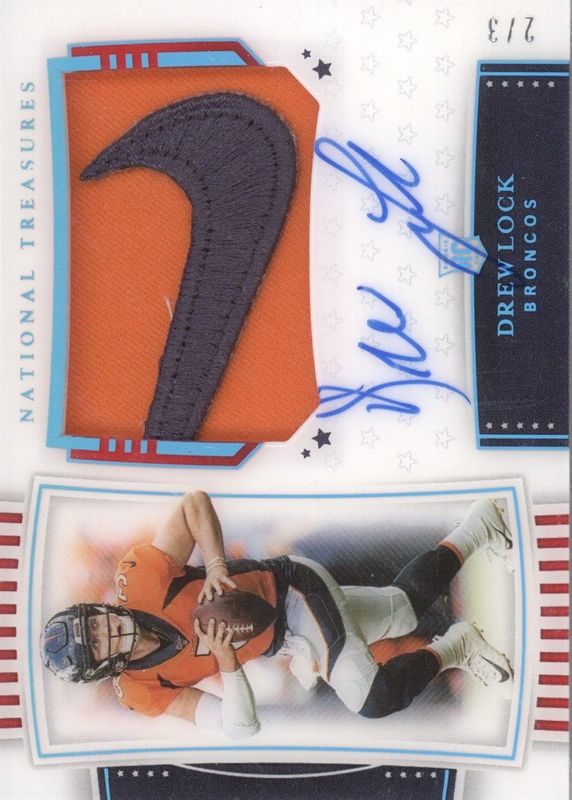 This card is 1 of 11 Drew Lock's card variations in the 2019 National Treasures set being tracked by Sports Card Investor, including Rookie Patch Auto /99, Rookie Patch Auto - Green Jersey Number (/3), Rookie Patch Auto - Holo Silver /25, Rookie Patch Auto - Midnight /20, and Rookie Patch Auto - Holo Gold /10.