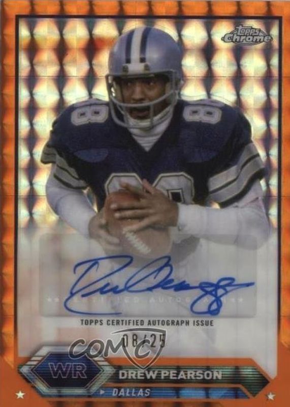The Drew Pearson 2023 Topps Composite #TCA-DPE Chrome Autographs - Geometric Orange /25 card in Raw condition has not changed in price in the last 30 days and was last sold for $35.03 .